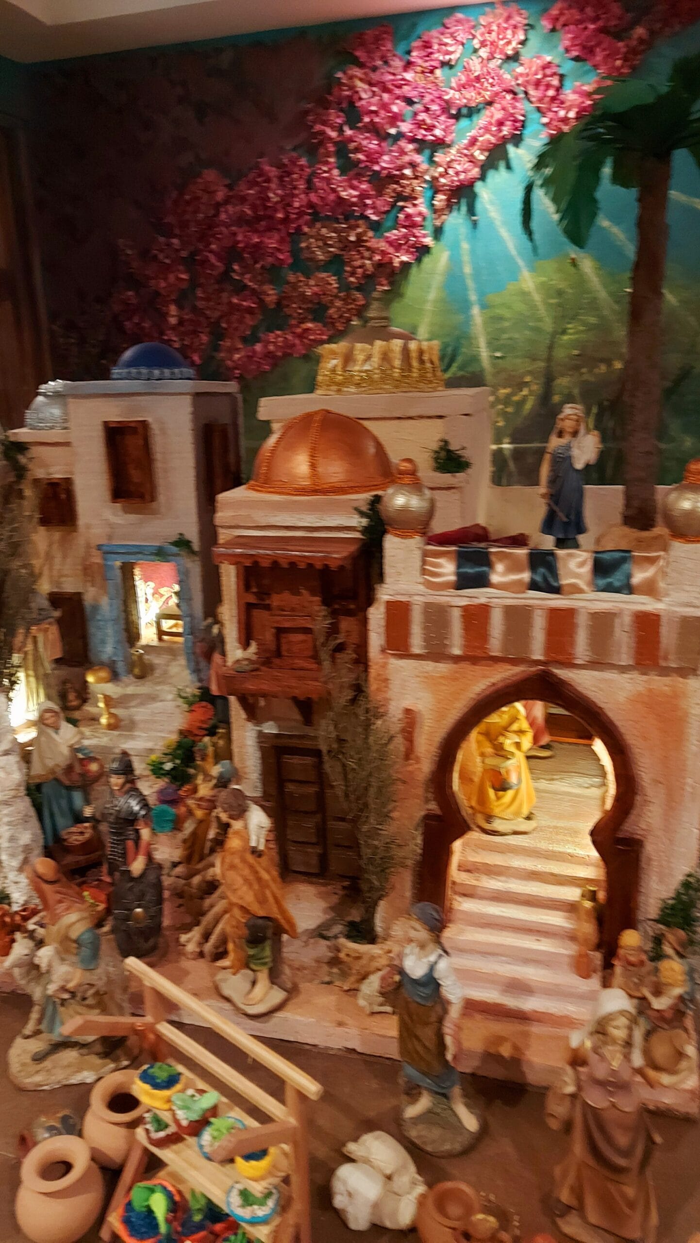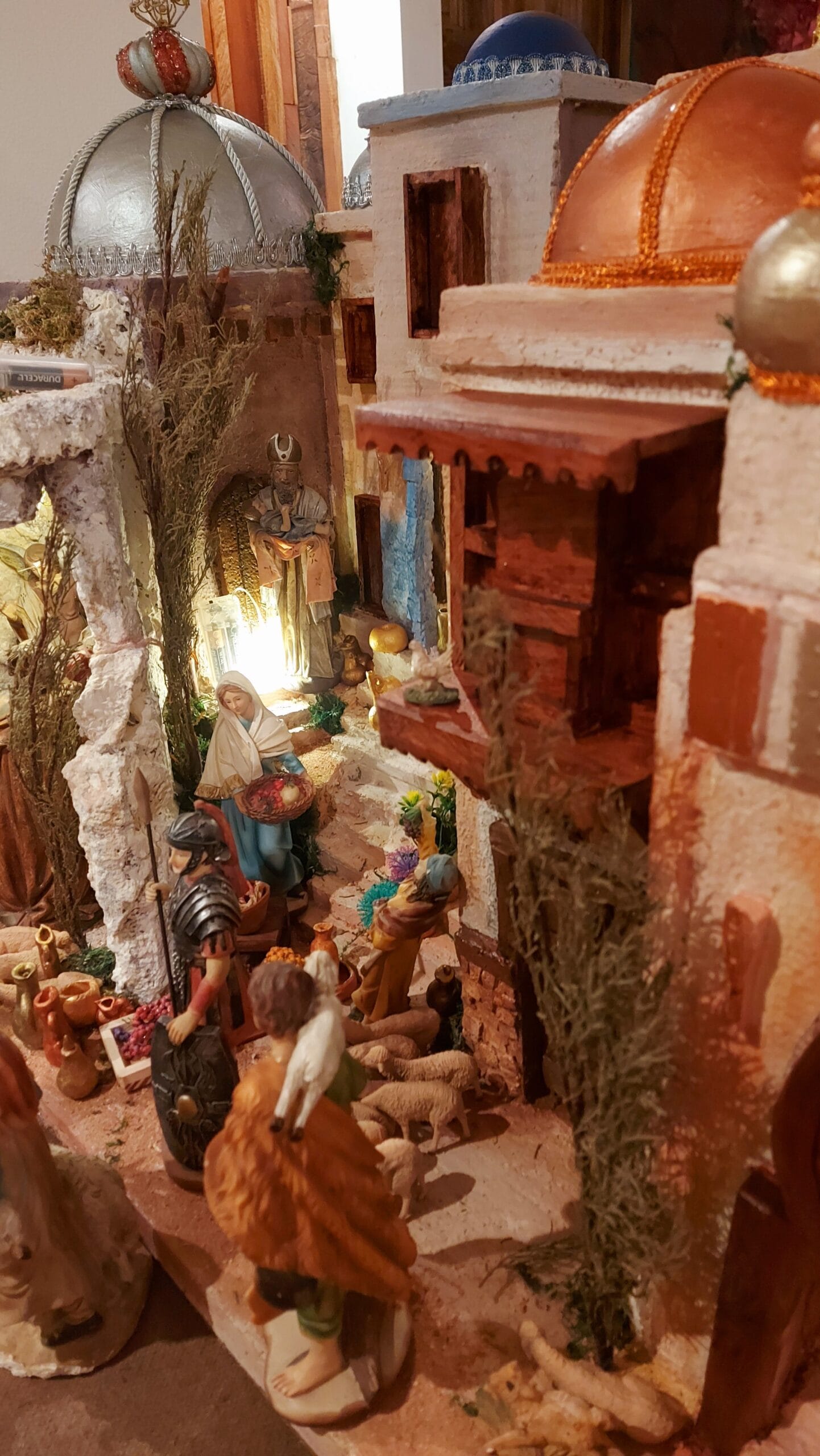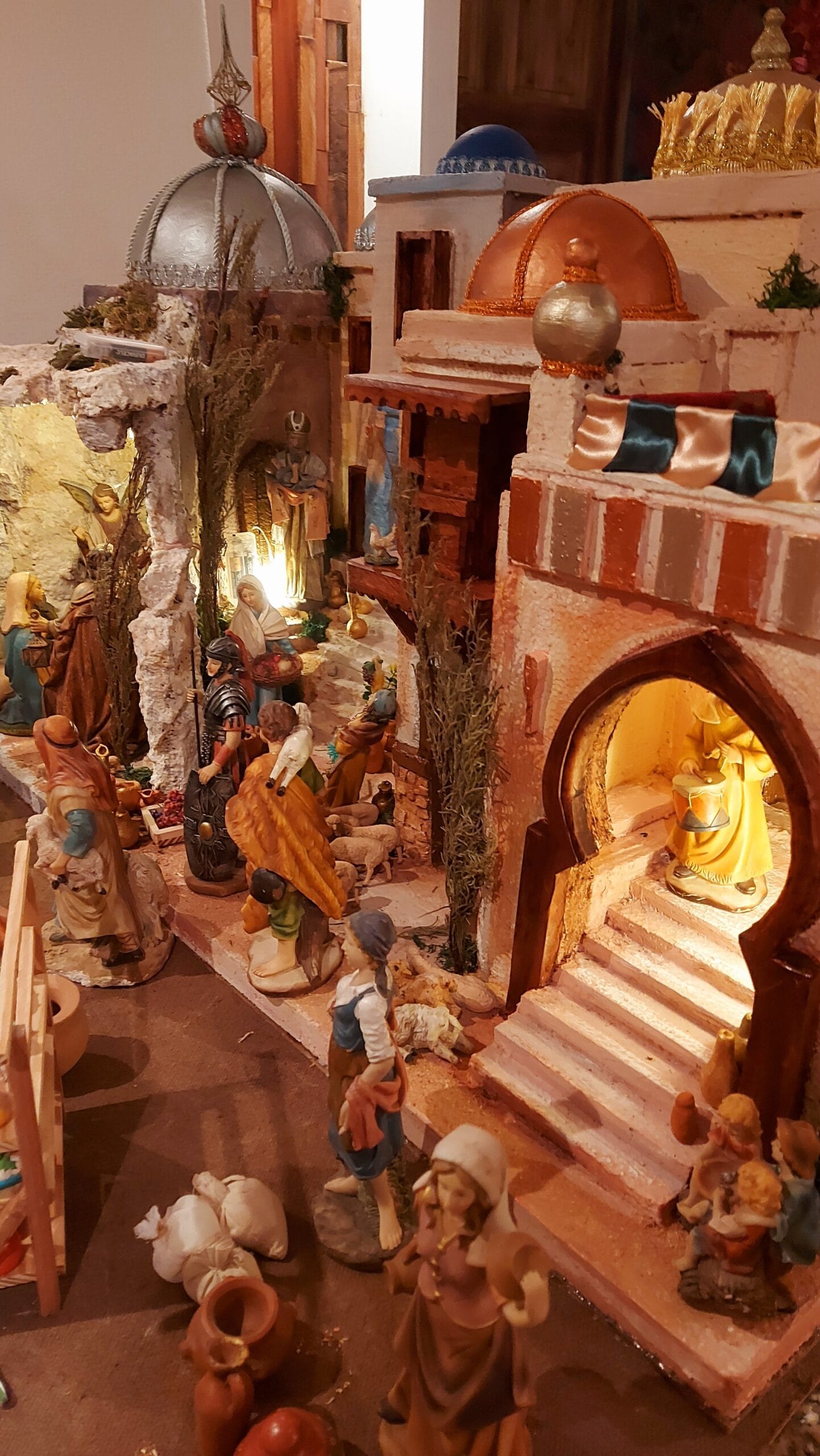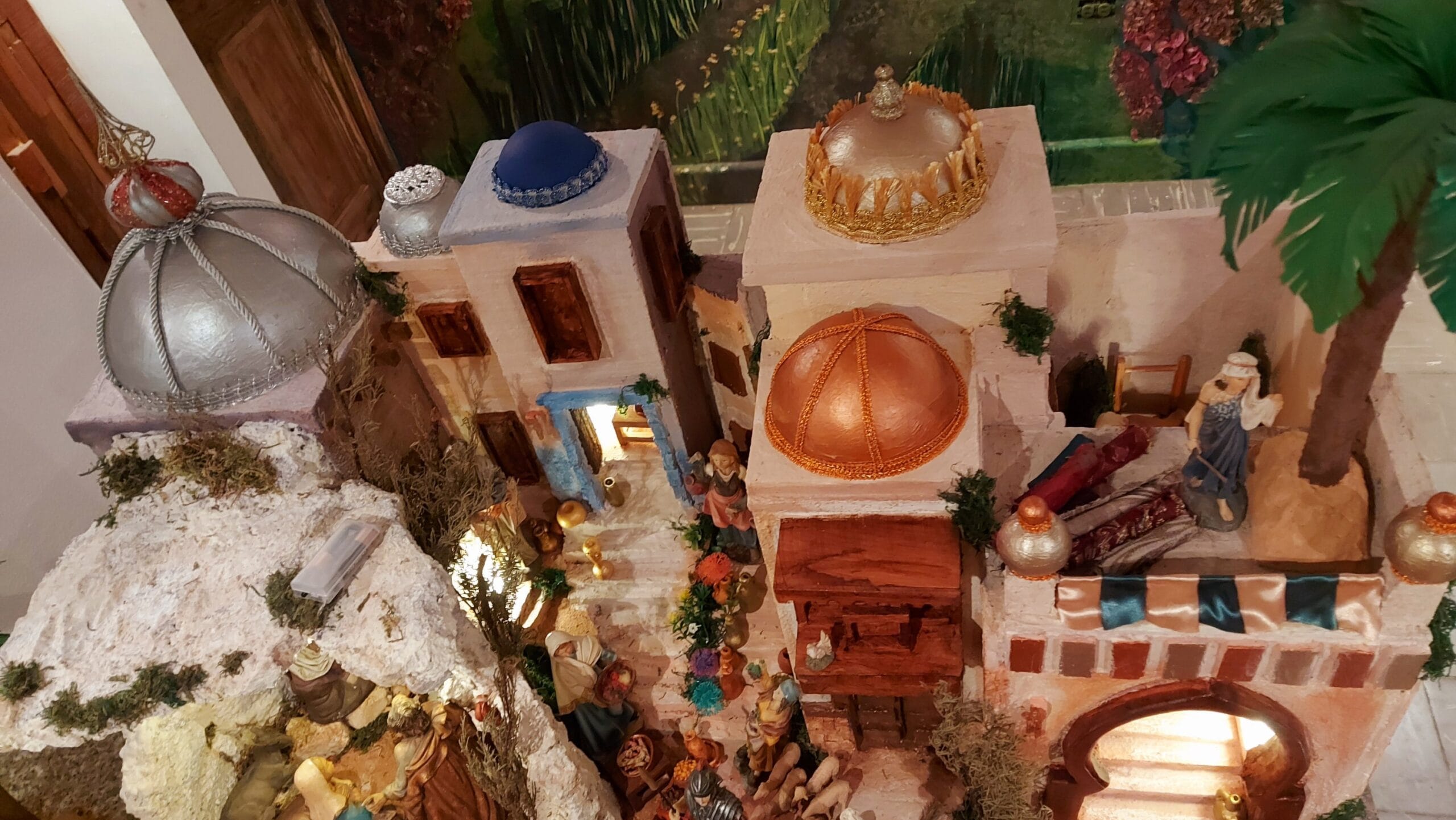 Su composición incluye templos majestuosos con cúpulas decoradas, casas en diferentes estilos con acabados en piedra y madera, pasajes que conectan las edificaciones y mercados artesanales que evocan la vida cotidiana de la época. El portal, con acabado rocoso, destaca como punto central para el misterio del nacimiento, rodeado de detalles que transmiten calidez y autenticidad.