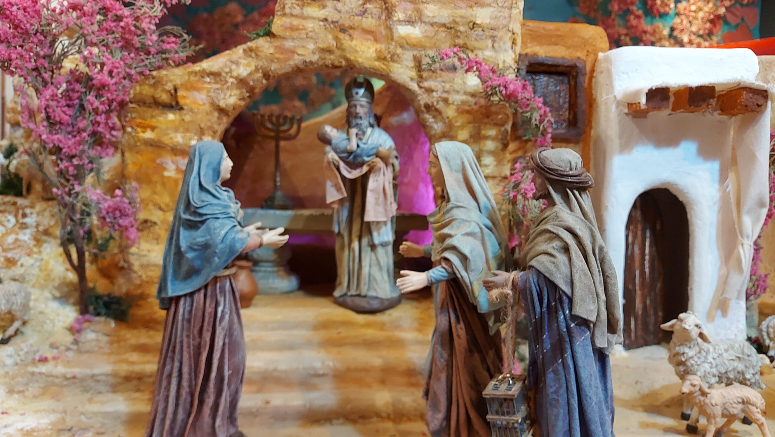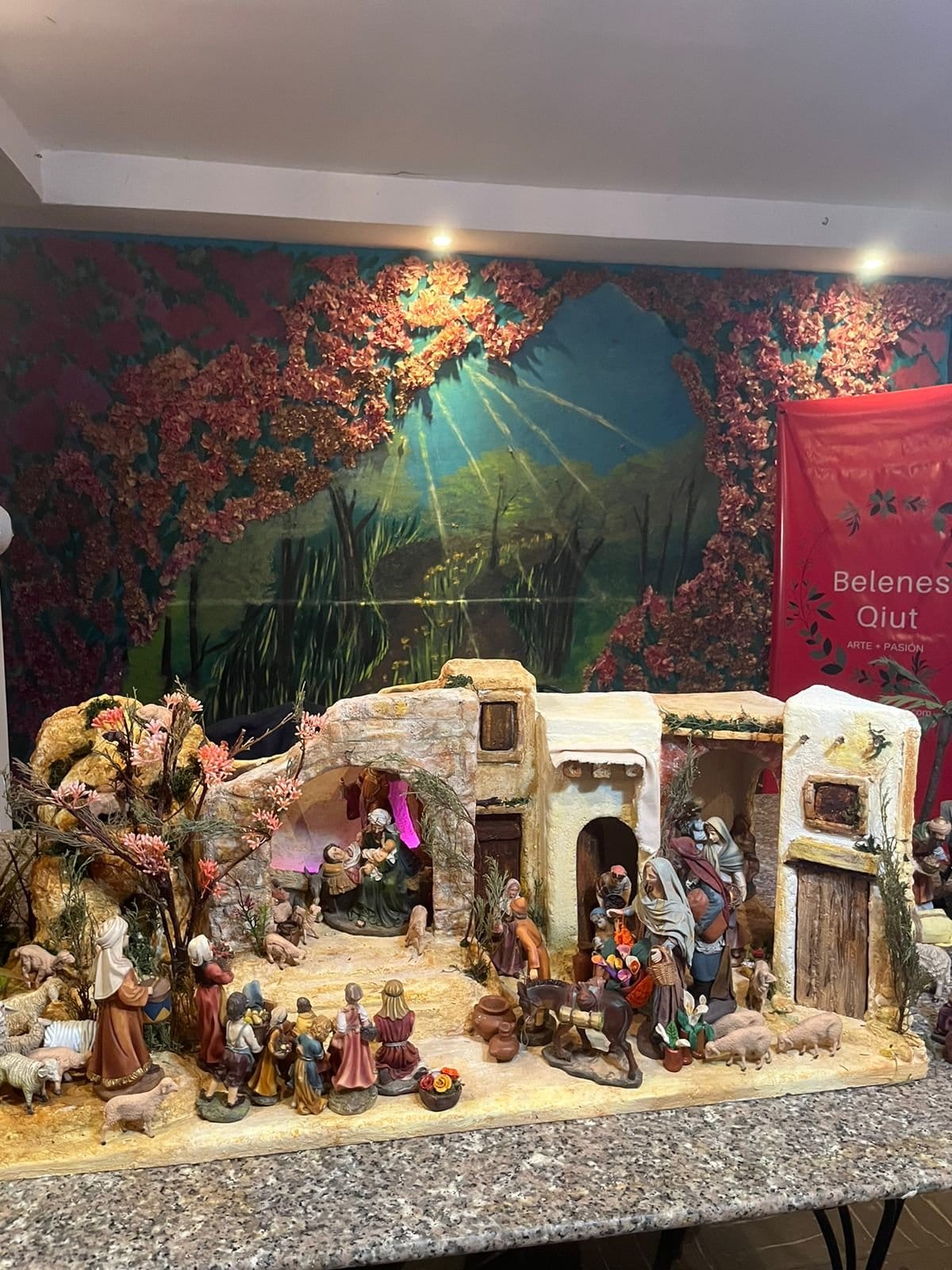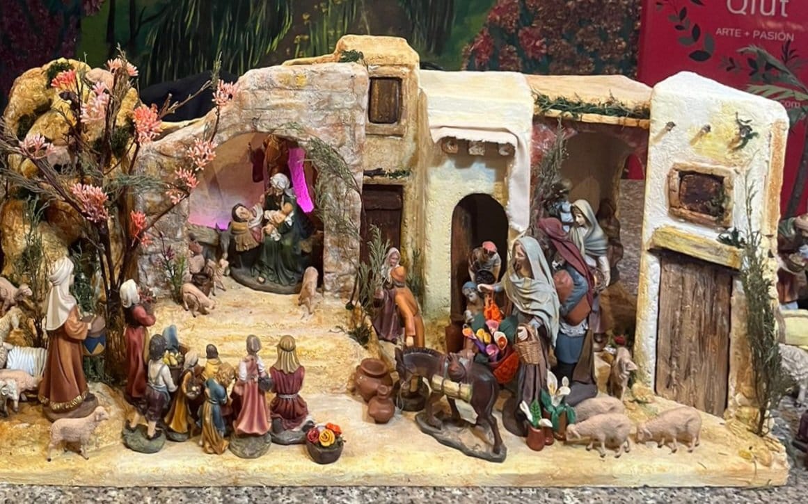 El Portal de los Recuerdos es un Belén cuidadosamente diseñado para ofrecer una experiencia visual y sensorial completa. Está compuesto por cuatro edificios, cada uno con tres puertas, que conforman un pequeño poblado con un arco de entrada principal que sirve de punto focal. La colina integrada en el conjunto agrega relieve y profundidad, recreando un paisaje natural con vegetación cuidadosamente detallada y árboles pintados en colores vivos que aportan un toque de realismo y calidez.