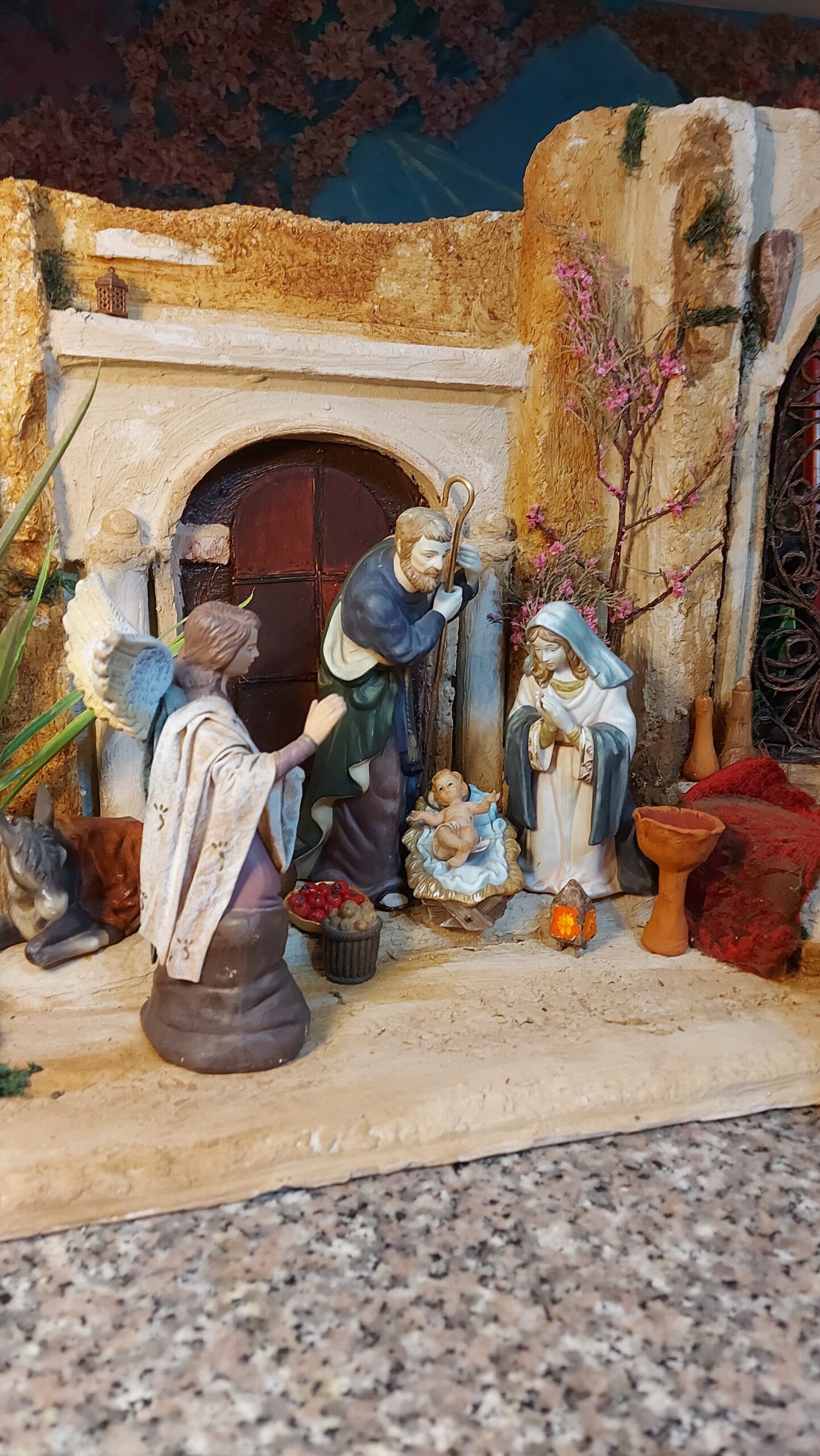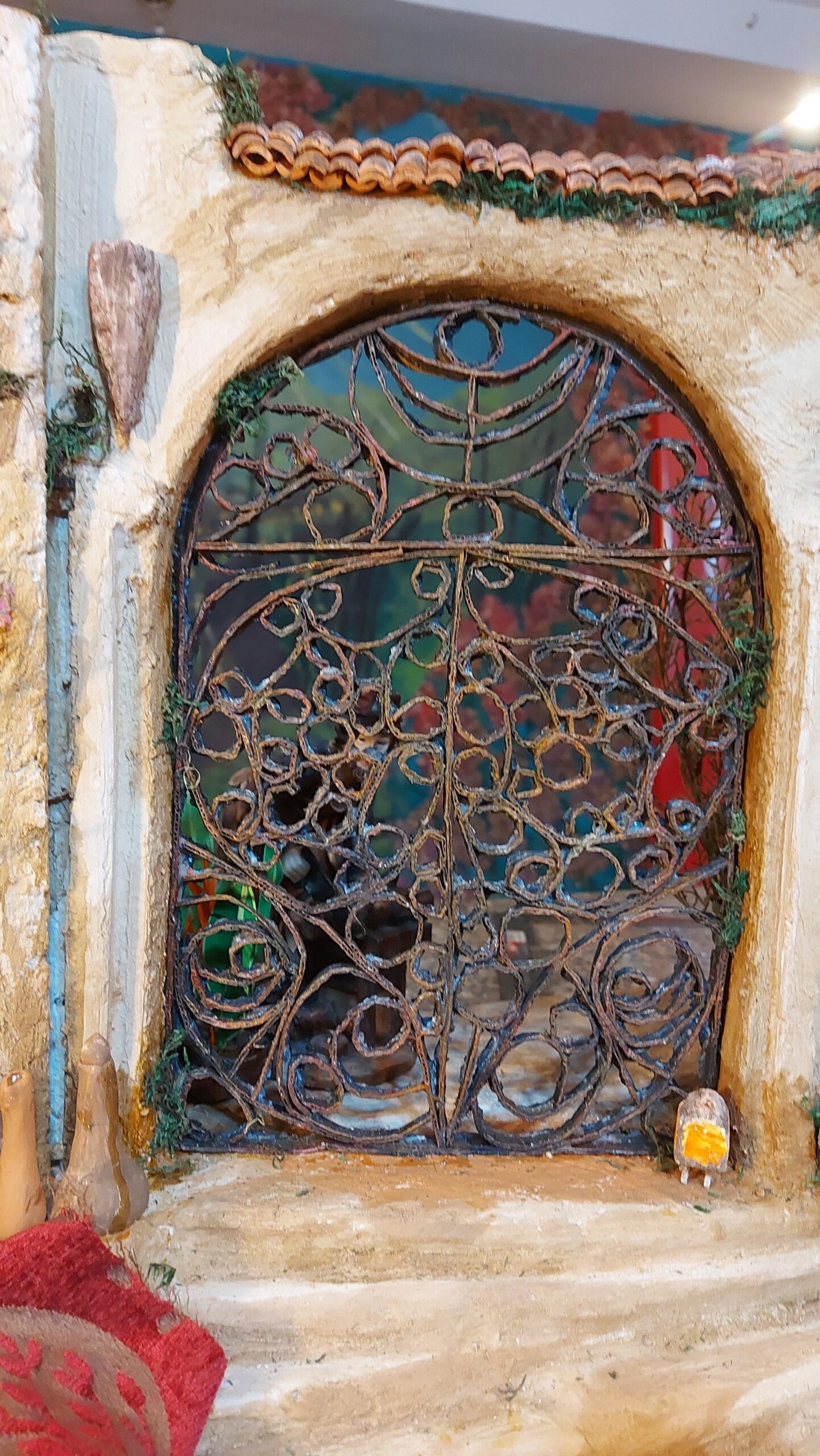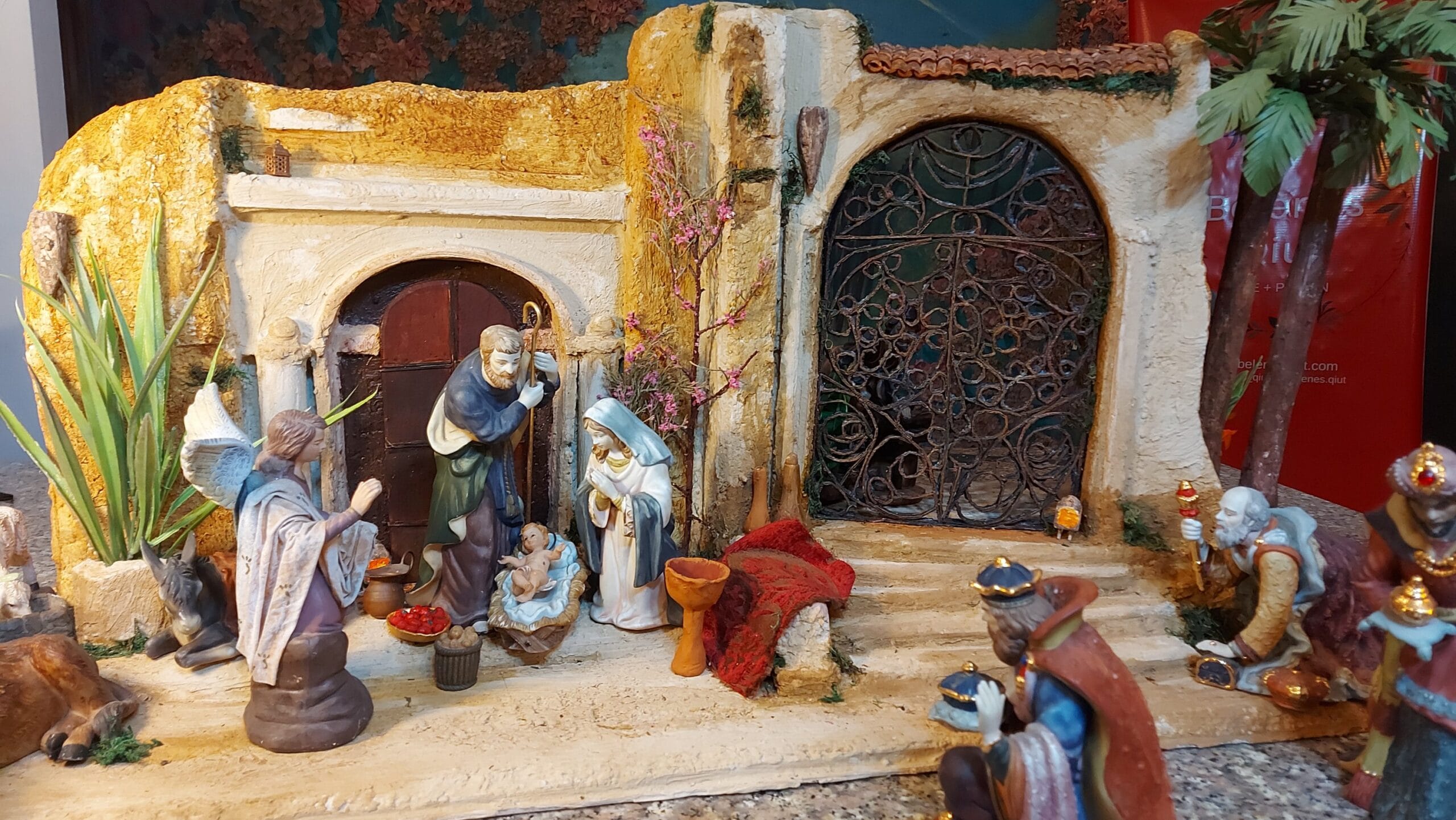 Una pieza artesanal única que combina lo tradicional con un toque distintivo. La estructura evoca la calidez de los portales de Belén con muros en tonos ocres y texturas rústicas, mientras que su gran protagonista es una imponente puerta central que imita el hierro forjado, trabajada en materiales ligeros pero acabada con tal realismo que transmite la sensación de fuerza y solemnidad. Este detalle, poco usual en un pesebre, convierte la escena en un punto focal de gran impacto visual, un verdadero umbral simbólico hacia el misterio del nacimiento.